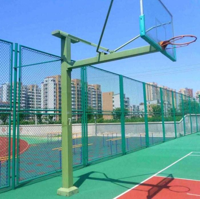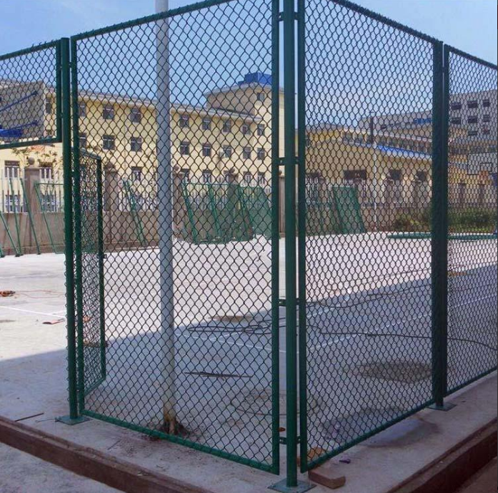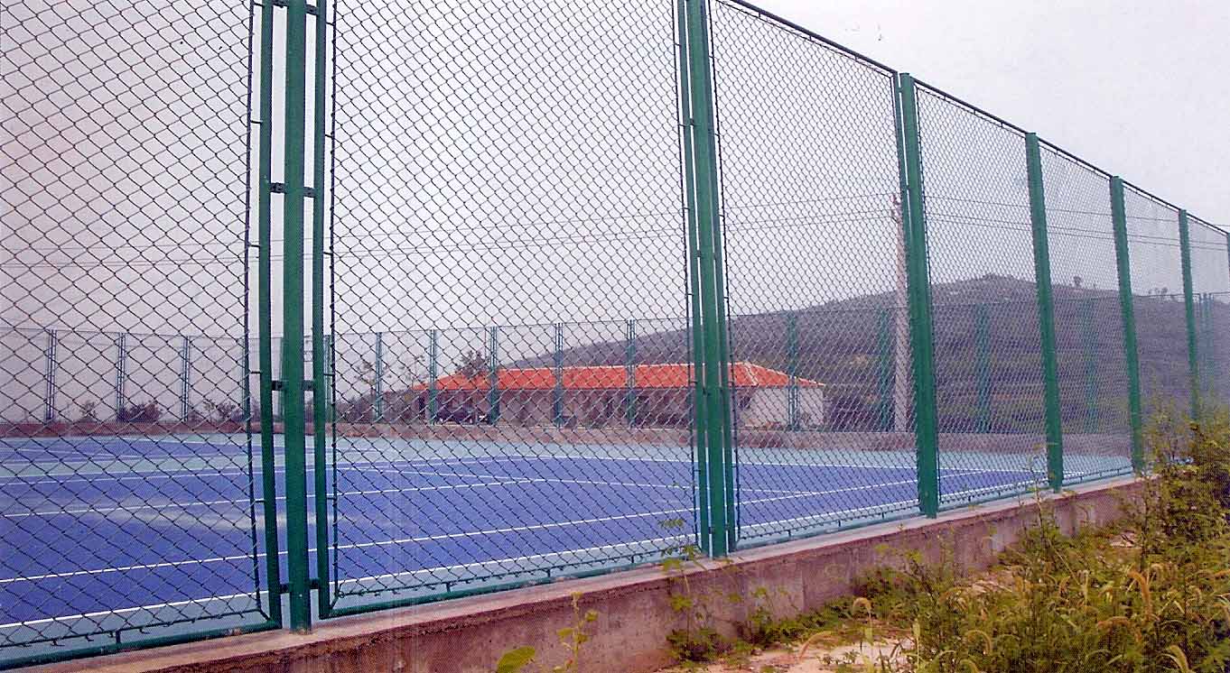 采用φ3.8鍍鋅線包塑網,網孔規格45MM×45MM,網高4 M,立柱用φ75鋼管,橫柱用φ60鋼管刷二遍防銹專用底漆,二遍墨綠色面漆,包塑網用包塑扁鐵壓緊,用鍍鉻螺絲固定于網架上.做一扇1200×2000MM單門. 在基礎施工時,按照預埋件施工示意圖所標明的尺寸,須先預埋好預埋件。挖500*500的地槽,燈柱預埋件的尺寸為300*300mm,圍網預埋件的尺寸為 250*250mm。每個預埋件用4個12mm的鋼筋焊接固定,鋼筋的長度為400mm。鋼筋在端部彎起。 圍網由包塑網、立柱、橫桿以及連接構件組成。網高4米,所以在圍網中間設立一跟橫桿,用φ75鋼管,主要增強圍網的受力。圍網立桿的間距由球場四周范圍的尺寸決定,一般間距不超過3.8米。也不能太小,否則增加成本。